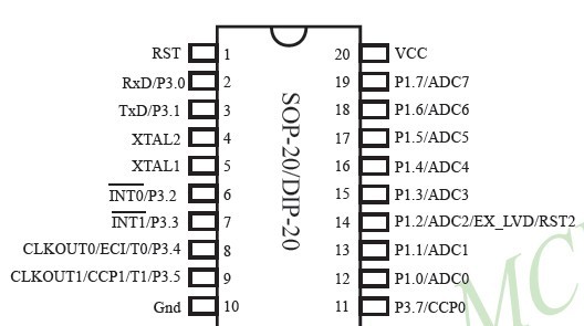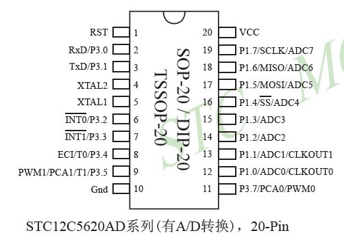 他們都是20pin的小芯片,從上圖中我們可看出STCLE5202AD的p1口要多出了不少的功能,比如p1.5到1.7的spi接口功能,p1.1 p1.0也多了clkout的第2功能 ,p3.7多了pwm功能。