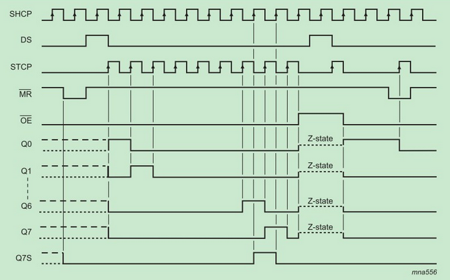 寄存器總是比存儲寄存器早一個脈沖。移位寄存器有一個串行移位輸入(Ds),和一個串行輸出