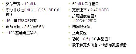 AD5429/AD5439/AD5449分別是CMOS、8/10/12位、雙通道、電流輸出的數(shù)模轉(zhuǎn)換器(DAC)。這些芯片均采用2.5 V至5.5 V電源供電,因此適合電池等低功耗的場(chǎng)合.芯片采用CMOS亞微米工藝制造,能夠提供出色的四象限乘法特性,大信號(hào)乘法帶寬達(dá)10 MHz。