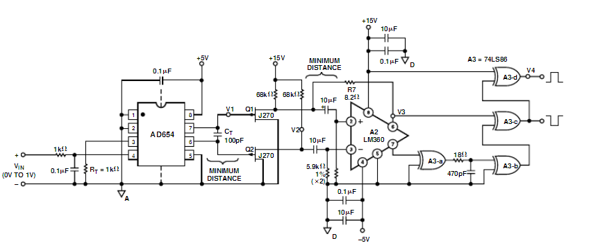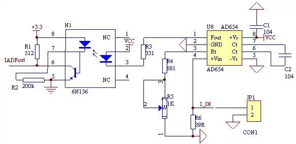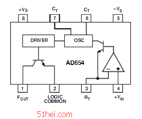 電壓—頻率變換(VFC)式模/數轉換器AD654芯片,由輸入放大器、精密振蕩器系統和高電流輸出級組成。它只需要一個簡單的RC網絡,即可設置最高500 kHz的任意滿量程(FS)頻率和最高±30 V的任意FS輸入電壓。在250 kHz滿量程時,線性誤差僅為0.03%,保證工作動態范圍為80 dB。整體溫度系數(不包括外部元件的影響)典型值為±50 ppm/°C。AD654采用5 V至36 V單電源供電,靜態電流僅為2.0 mA。
