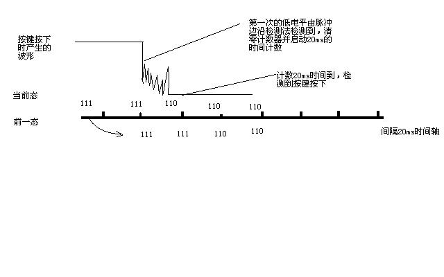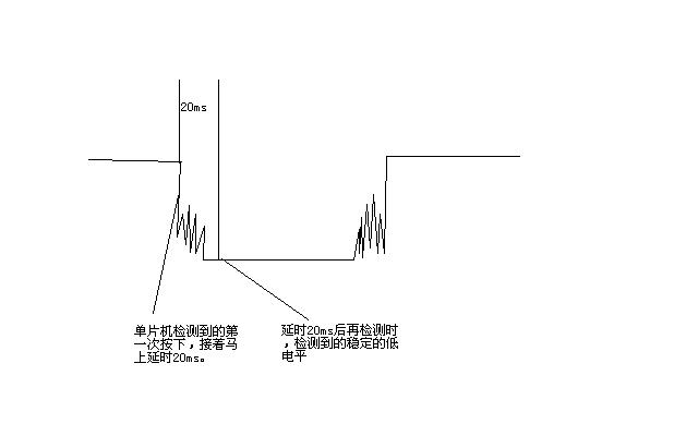 按鍵在按下時會產生抖動,釋放時也會產生抖動,所以在設計鍵盤掃描程序時必須考慮按鍵的消抖,我們一般只考慮按下時的抖動,而放棄對釋放時抖動的消抖。抖動時間一般為20ms左右。按下的最終結果是低電平。