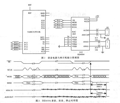 ISD4004與單片機(jī)連接較為簡(jiǎn)單,單片機(jī)的P1.2~P1.4分別控制ISD4004的片選信號(hào)SS、串行輸入引腳MOSI、串行輸出引腳MISO及串行時(shí)鐘輸入。值得注意的是ISD4004供電電壓為3 V,需要專門的穩(wěn)壓電路。同相模擬輸入(ANAIN+)和反相模擬輸入(ANAIN一)端最大輸入電平為16mV。音頻輸出可直接接人電話機(jī)受話器端代替麥克風(fēng)。