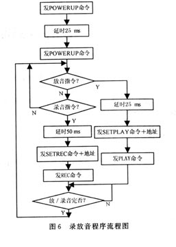 錄放音程序主要是接收指令后通過SPI總線對(duì)ISD4004進(jìn)行控制。需要注意的是系統(tǒng)在啟用前,要預(yù)先錄制報(bào)警語音,為了能靈活播放語音信息,報(bào)警語音是分段存放在ISD4004中的,播放時(shí)根據(jù)地址播放每段語音。播放時(shí)要根據(jù)每段錄音的長(zhǎng)短做相應(yīng)的延時(shí)。
