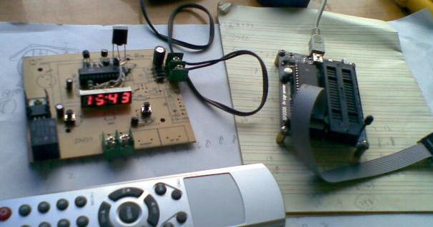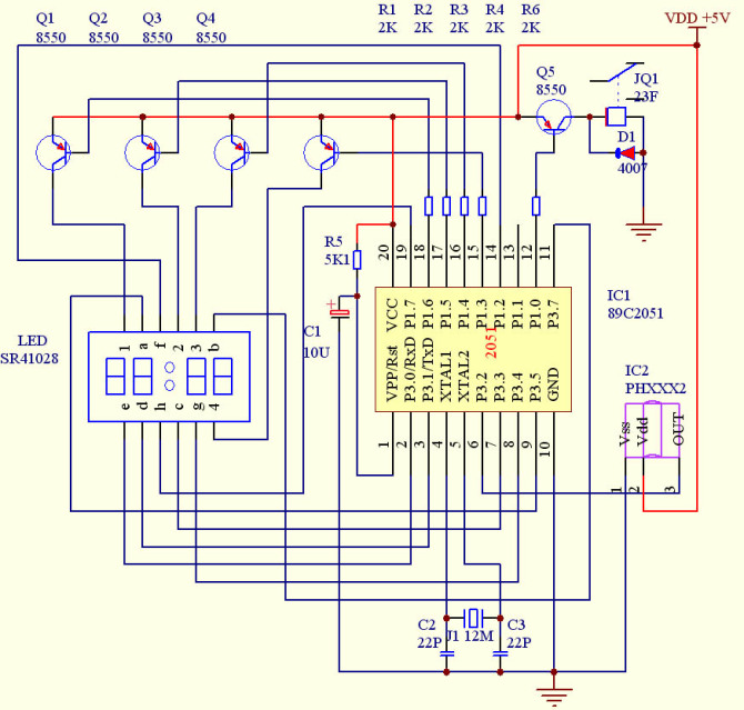 閑來無事,練練單片機編程。在原來的一個數字鐘的基礎上增加紅外遙控功能。硬件是2051單片機,int0口作為紅外信號輸入。紅外接收頭用家電中常用的一體化接收頭。腳位是地,正電源,信號輸出。信號輸出腳接到2051的第6腳,平時紅外輸出呈高電平,收到信號時呈低電平,2051產生外部中斷。程序中加入外部中斷int0中斷處理代碼和定時器1中斷處理代碼。定時器1作為計數器,用于測量紅外信號的脈沖寬度。int0處理過程,關閉計數器1,取出數值放到一個數組中。當數組長度達到34時,取出數據,根據脈沖寬度分辨0和1,測得寬度分別是4和8,取其平均值,大于6的為1,小于6的為0。其中,10到18位為識別碼,18到26位為數據。識別碼用于區別不同廠家的遙控器。