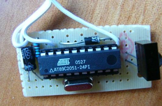 電路很簡單,AT89C2051+12M晶振+阻容復位級成最小系統,紅外接收頭接在INT0, P1.7接進倉開關,P1.6通過一只二極管接播放鍵。