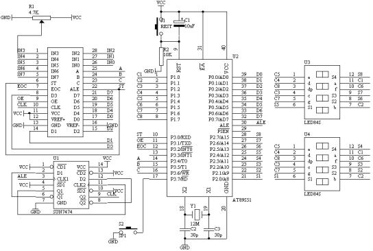 (1). 進行A/D轉換時,采用查詢EOC的標志信號來檢測A/D轉換是否完畢,若完畢則把數據通過P0端口讀入,經過數據處理之后在數碼管上顯示。