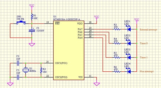 HT48R50A-1 的PA4-PA7各自接一個LED,以便指示正在執(zhí)行哪一個中斷子程序或主程序。