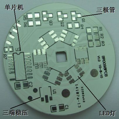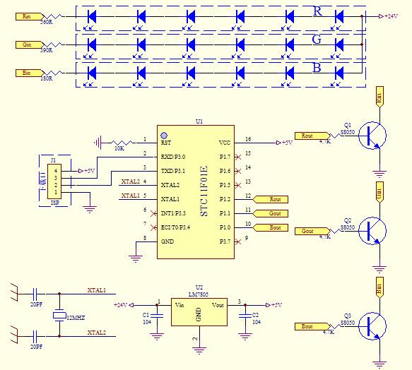 (采用5050LED 2W) RGB三色LED控制引腳分別為單片機P1.2 、 P1.1 、 P1.0。LED正極接主電源(24V)正極,負極接驅(qū)動3顆三極管的集電極,單片機控制腳分別接3顆NPN三極管,三極管發(fā)射極接地,而單片機的供電是來自三端穩(wěn)壓器7805,祥細原理如下: