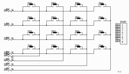 個按鈕按下后,使相應的兩個觸點接通,相應行上的IO 可以讀到低電平。