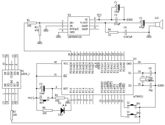 根據(jù)設(shè)定好的密碼,采用二個(gè)按鍵實(shí)現(xiàn)密碼的輸入功能,當(dāng)密碼輸入正確之后,鎖就打開,如果輸入的三次的密碼不正確,就鎖定按鍵3秒鐘,同時(shí)發(fā)現(xiàn)報(bào)警聲,直到?jīng)]有按鍵按下3種后,才打開按鍵鎖定功能;否則在3秒鐘內(nèi)仍有按鍵按下,就重新鎖定按鍵3秒時(shí)間并報(bào)警。