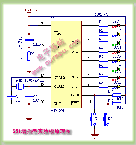 S51增強型單片機實驗板上有8個高亮度發光二極管(見圖1所示),可以用來做單片機流水燈、跑馬燈。。。等實驗,電路原理圖見下圖3。