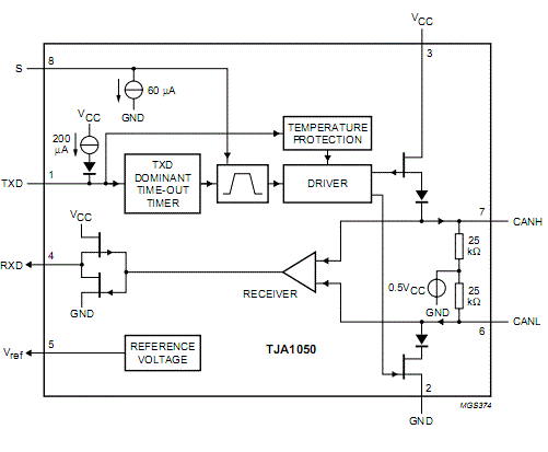 首先CAN網(wǎng)絡(luò)里用到傳輸線,線材的特性阻抗為120歐姆。關(guān)于這跟線下面的問(wèn)題來(lái)討論,另外要說(shuō)明的是在CAN網(wǎng)絡(luò)里的設(shè)備,即CAN收發(fā)器,這種器件的輸出阻抗很低,輸入阻抗是比較高的,可以見(jiàn)TJA1050的框圖,也就是說(shuō)在傳輸線上120歐姆的特性阻抗傳輸?shù)男盘?hào)突然到了一個(gè)阻抗很高的地方,可以理解為斷路,這樣會(huì)產(chǎn)生很高的信號(hào)反射,影響CAN收發(fā)器對(duì)電平的采樣,造成信息的誤讀。如果在CANH和CANL之間加上一個(gè)120歐姆的電阻即終端電阻,因?yàn)檫@個(gè)電阻和線纜特性阻抗相同,同時(shí)這個(gè)遠(yuǎn)小于CAN收發(fā)器輸出阻抗的電阻和CAN收發(fā)器并聯(lián)在一起,電流自然更多的從阻抗小的地方流過(guò),這樣從特征阻抗120歐姆的線纜上流道120歐姆的電阻上,他們之間阻抗接近,他們的信號(hào)反射就要小很多,可以有效的保證信號(hào)完整性。同時(shí)這個(gè)電阻也不會(huì)影響信號(hào)本身如下圖,例如在一個(gè)容錯(cuò)CAN網(wǎng)絡(luò)里,CANH=3.5v,CANL=0.5v的時(shí)候?yàn)轱@性,CANH=CANL=2.5v的時(shí)候?yàn)殡[形,在顯性位的時(shí)候終端電阻兩端分別為3.5v和1.5v,一個(gè)CAN收發(fā)器為輸出端一個(gè)CAN收發(fā)器為接收端,輸出端在輸出電壓,保持CANH和CANL的電壓為 3.5v和1.5v不變,他們之間的電壓差將產(chǎn)生電流由終端電阻消耗掉,接受端的CANH和CANL可以準(zhǔn)確的采樣到3.5v和1.5v的電壓值,同理在隱形位的時(shí)候終端電阻也是不影響CAN網(wǎng)絡(luò)的信號(hào)但是達(dá)到了阻抗匹配的作用。