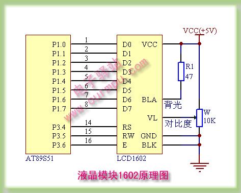 TC1602EL液晶顯示模塊可以和51系列單片機直接接口,下面就是S51增強型實驗板的液晶接口電路(圖2)。