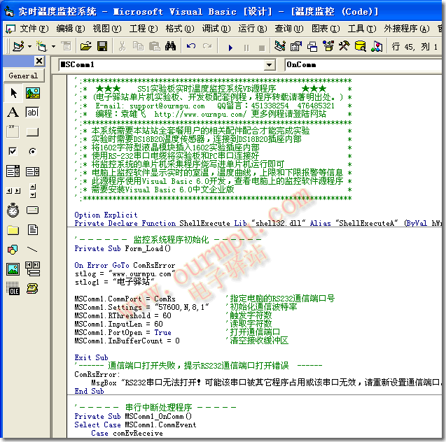 2、在計算機上,VB6.0編寫的實時溫度監控系統軟件通過RS-232串口接收S51增強型單片機實驗板發送過來的實時數據,經過運算處理后將DS18B20的傳感器ID、實時溫度顯示在軟件界面上;同時,繪制出溫度變化曲線,根據我們設定的上限報警溫度和下線報警溫度,判斷當前溫度有無高溫報警或低溫報警,如果溫度超限,則給出相應的報警信息。