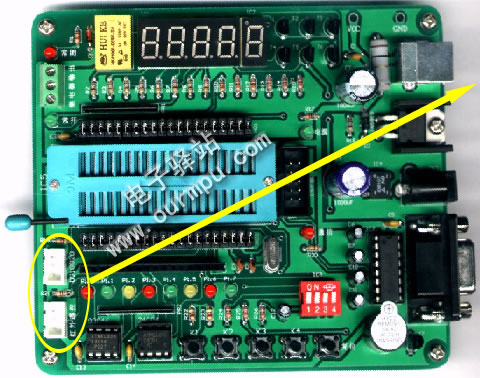 注:如圖中所示,實驗板的第5位數(shù)碼管可以顯示溫度的符號"℃",做溫度實驗更加直觀。將配套溫度傳感器插入DS18B20實驗接口,完成溫度傳感器的硬件連接。 |