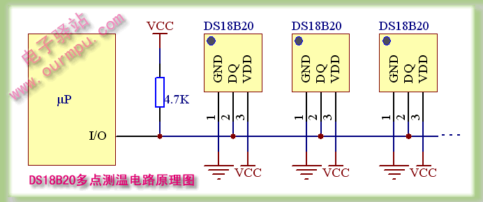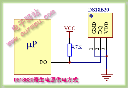 注: 站長曾經就此電路做過實驗,在實驗中,降低電源電壓VCC,當低于4.5V時,測出的溫度值比實際的溫度高,誤差較大。。。當電源電壓降為4V時,溫度誤差有3℃之多,這就應該是因為寄生電源汲取能量不夠造成的吧,因此,站長建議大家在開發測溫系統時不要使用此電路。