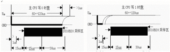 對于DS18B20寫0時序和寫1時序的要求不同,當要寫0時序時,單總線要被拉低至少60us,保證DS18B20能夠在15us到45us之間能夠正確地采樣IO總線上的“0”電平,當要寫1時序時,單總線被拉低之后,在15us之內就得釋放單總線。