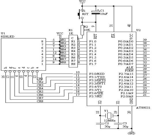 因此,形成的列代碼為 00H,00H,3EH,41H,41H,3EH,00H,00H;只要把這些代碼分別送到相應的列線上面,即可實現“0”的數字顯示。