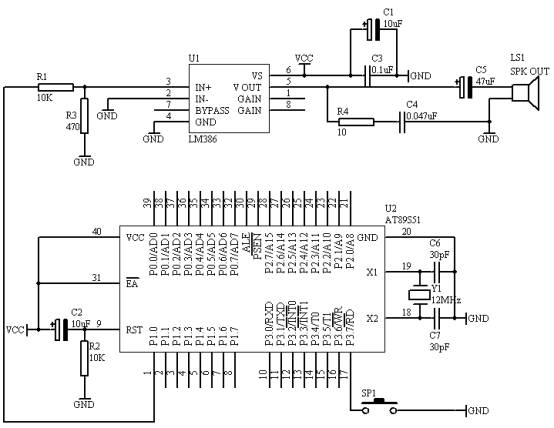 當按下開關SP1,AT89S51單片機產(chǎn)生“叮咚”聲從P1.0端口輸出到LM386,經(jīng)過放大之后送入喇叭。