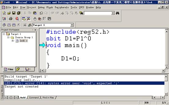 這就表示程序語法上沒有錯誤,當然如果有錯誤,剛編譯不能通過,現在我們更改程序,如我們把“sbit D1=P1^0; ”后面的“; ”,再次編譯,此時會出現錯誤提示界面如圖8所示。