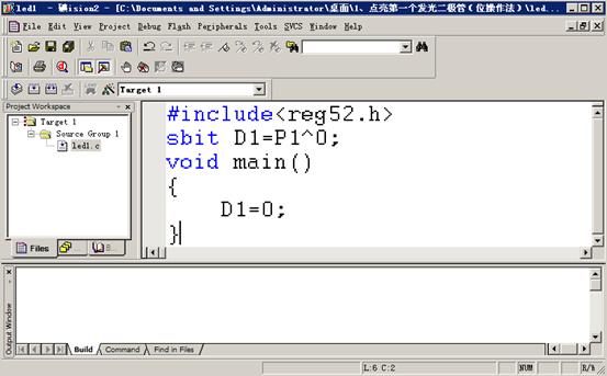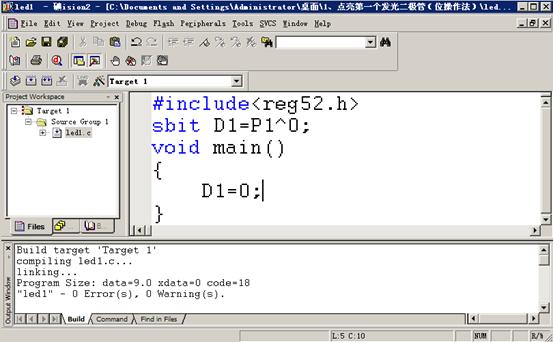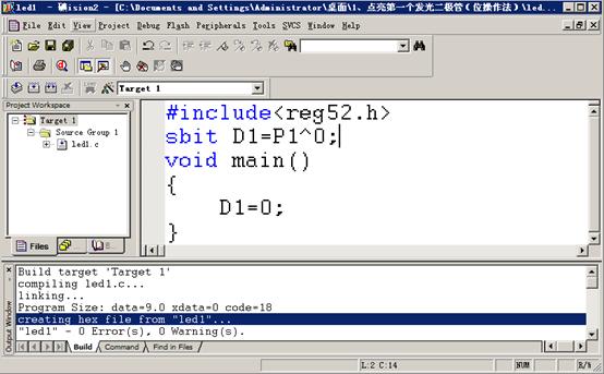 上面我們介紹了發光二極管的發光原理,同時對實驗板上的原理圖作了相應的分析,下面給出點亮第一個發光管具體程序。關于工程文件的建立,前面已經詳細的講過,這里不在敘述,這里我們點擊keil軟件,建立工程LED1,然后建立文件LED1,最后輸入程序如下。