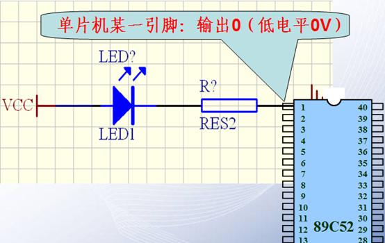 下面我們把電路稍作變化,如圖3,把圖2中接地的一端直接接到單片機的P1口的第1個引腳上,大家想想現在怎么才能讓發光二極管發光呢?可能大家馬上會說出,讓單片機第1腳輸出低電壓,而單片機的引腳可以輸出0和1兩種電平,0代表低電平也就是低電壓,1代表高電平也就高電壓這個我們在前面的課程中講過,也就是說我們現在只要能通過程序讓每1腳輸出0就可以了。