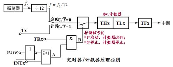 從圖2中我們還可以看出,定時器/計數器還有一個控制開關,此開關可以控制定時器計數器相應的啟動和停止。而此開關的開閉主要是由圖2左下部的TRX 、GATE等信號共同作用,這里都是門電路,可以由數電的知道解釋,因為比較簡單,這里我就不作說明,后面結合的相關的寄存器進行介紹。