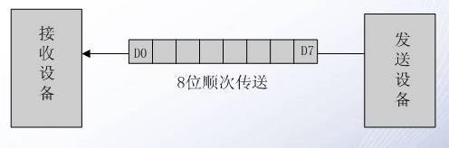 串行通信是將數據字節分成一位一位的形式在一條傳輸線上逐個地傳輸,如圖2所示。 串行通信的特點:傳輸線少,長距離傳送時成本低,且可以利用電話網等現成的設備,但數據的傳送控制比并行通信復雜。