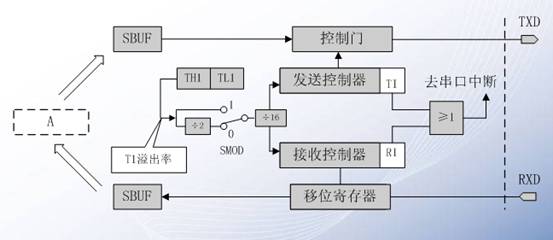 圖中共有兩個串行口緩沖寄存器(SBUF),一個是發送寄存器,一個是接收寄存器,以便單片機能以全雙工方式進行通信。串行發送時,從片內總線向發送SBUF寫入數據;接收時,從接收SBUF向片內總線讀出數據。它們都是可尋址的寄存器,但因為發送和接收不能同時進行,所以給這兩個寄存器賦以同一地址99H.