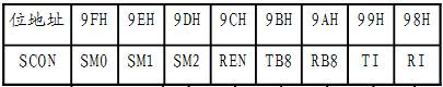 串行控制寄存器SCON用于設置串行口的工作方式、監視串行口的工作狀態、控制發送與接收的狀態等。它是一個既可以字節尋址又可以位尋址的8位特殊功能寄存器。其格式如下。