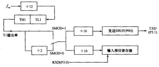 工作方式1的波特率是可變,波特率的產生與定時器1有關,其產生的電路如圖4所示。