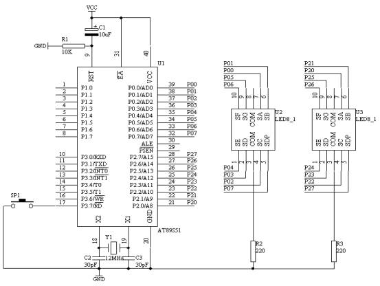 利用AT89S51單片機來制作一個手動計數器,在AT89S51單片機的P3.7管腳接一個輕觸開關,作為手動計數的按鈕,用單片機的P2.0-P2.7接一個共陰數碼管,作為00-99計數的個位數顯示,用單片機的P0.0-P0.7接一個共陰數碼管,作為00-99計數的十位數顯示;硬件電路圖如圖19所示。