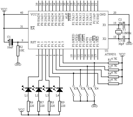 如圖4.3.1所示,AT89S51單片機的P1.0-P1.3接四個發光二極管L1-L4,P1.4-P1.7接了四個開關K1-K4,編程將開關的狀態反映到發光二極管上。(開關閉合,對應的燈亮狀態,開關斷開,對應的燈滅狀態)。