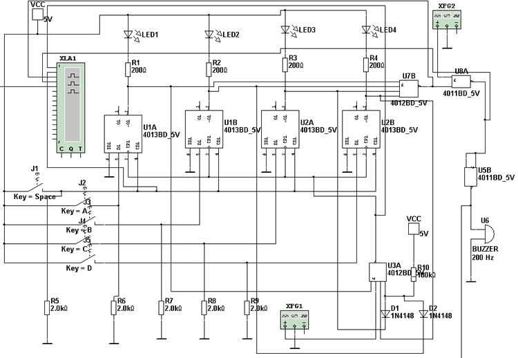 在此設計中,采用XFG1產生5KHZ的振蕩信號通過U3A作為U1A、U1B、U2AU2B(4013BD)的時鐘信號,使4013BD具備上升沿觸發脈沖,利用按鍵被按下,得到高電平加到D觸發器的D端,使得D觸發器翻轉,將其 輸出的低電平作為控制信號,控制U3A的打開與關閉,從而控制D觸發器的時鐘脈沖有無,達到控制D觸發器的打開與鎖死狀態,實現“搶答”的目的。
