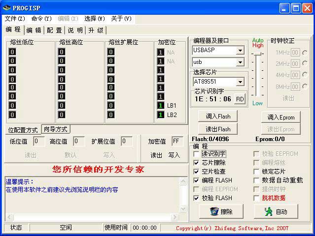 突然想起網(wǎng)上說(shuō)起過(guò)用修改過(guò)的固件可以針對(duì)51板出現(xiàn)的Chip Enable Program Error。立即上網(wǎng)找來(lái)那個(gè)18K大小的USBISP.hex,重做剛才的下載工作,一切順利,再運(yùn)行PROGISP1.6.6