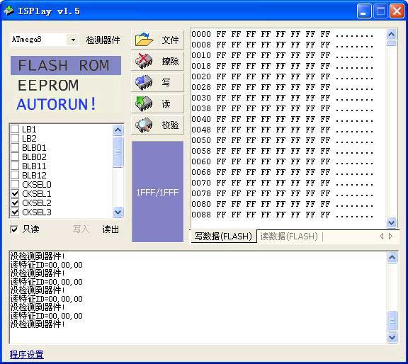 事先我將配置文件Pin_config.ini內(nèi)的各功能線(xiàn)已修改為和我的并口下載線(xiàn)相同的腳號(hào)。在左下角的“程序設(shè)置”里選好那個(gè)配置文件。點(diǎn)擊“檢測(cè)器件”鈕,但始終檢測(cè)不到器件,如上圖。我想我的并口下載線(xiàn)肯定是好的,一直在用啊!難道配置文件不起作用?或那個(gè)LE控制時(shí)序和我那個(gè)板上的要求不同?干脆用那個(gè)我一直使用的ISP-30A試試吧!于是將它運(yùn)行。因?yàn)槭且oATMEGA8下載程序,所以在器件選項(xiàng)里選MEGA8。