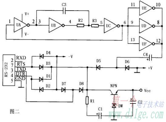字串3 如圖二所示。在PC機通電啟動初始化串行口前,RS-232接口中RXD、RTS、DTR信號線電壓約為-11V,經由圖中二極管向六反相器UA~UF供電,反相器UA~UC和電阻R2、R3、電容C3組成振蕩器,經UD~UF驅動輸出方波。通過電容C4耦合和二極管整流至R1、C1、T1、DW、C2組成的電壓調整電路產生供給系統的Vcc電壓。初始化串行口后,RS-232接口中DTR、RTS信號線電壓轉換為約+11V,也經電壓調整電路產生Vcc電壓,為單片機電路提供電源。
