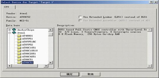 3)這時會彈出一個對話框,要求你選擇單片機的型號,你可以根據你使用的單片機來選擇,keil c51幾乎支持所有的51核的單片機,我這里還是以大家用的比較多的Atmel 的89C51來說明,如下圖所示,選擇89C51之后,右邊欄是對這個單片機的基本的說明,然后點擊確定.