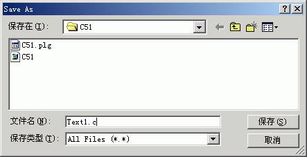 此時光標在編輯窗口里閃爍,這時可以鍵入用戶的應用程序了,但筆者建議首先保存該空白的文件,單擊菜單上的“File”,在下拉菜單中選中“Save As”選項單擊,屏幕如下圖所示,在“文件名”欄右側的編輯框中,鍵入欲使用的文件名,同時,必須鍵入正確的擴展名。注意,如果用C語言編寫程序,則擴展名為(.c);如果用匯編語言編寫程序,則擴展名必須為(.asm)。然后,單擊“保存”按鈕。