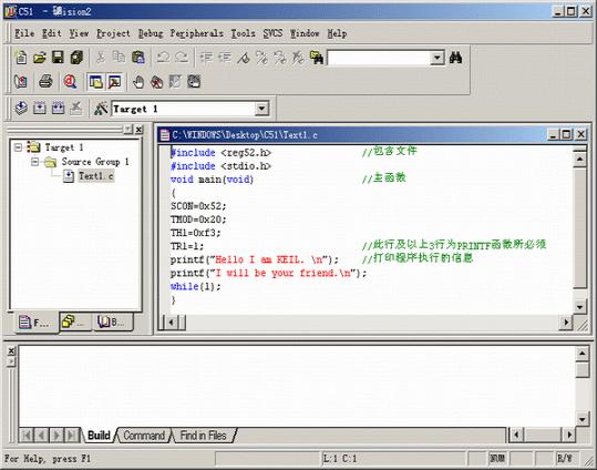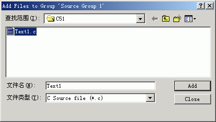 注意到“Source Group 1”文件夾中多了一個子項“Text1.c”了嗎?子項的多少與所增加的源程序的多少相同
