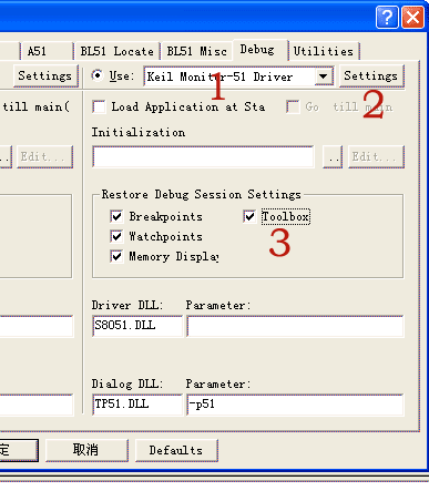 圖 10-3 項目設置 首先要在你要仿真的程序項目設置仿真器所使用的驅動,在 Debug 頁中選擇對應本仿真器的 KeilMon51 驅 動,如圖 10 中 1 所示。圖 10-3 的 3 是選擇在仿真時能使用的工具窗口,如內存顯示,斷點等等。按 2 進 行圖 10-4 中的仿真器設置。設置好串行口號,波特率,晶體震蕩器為 11.0592M 時選 38400。Cache Options 為仿真 緩選取后會加快仿真的運行的速度。設好后編譯運行程序就能連接仿真器了,連接成功會出現如圖 10-