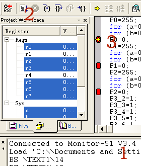 5 的畫面。如連接不成功就出現圖 10-6 的圖,這個時候能先復位電路再按"Try Again",還不成功連接的話則 應檢查軟件設置和硬件電路。圖 10-5 中 1 是指示仿真器的固件版本為 F-MON51V3.4 版。點擊 3 中小紅 點位置時為設置和取消斷點,點擊 2 則運行到下一個斷點。圖 10-7 則是變量和存儲器的查看。仿真器在