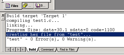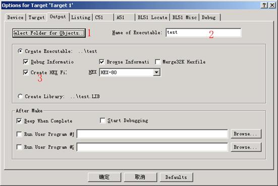 上一篇建立了第一個單片機C語言項目,但為了讓編譯好的程序能通過編程器寫入51芯 片中,要先用編譯器生成HEX文件,下面來看看如何用KEIL uVISION2來編譯生成用于燒寫 芯片的HEX文件。HEX文件格式是Intel公司提出的按地址排列的數(shù)據(jù)信息,數(shù)據(jù)寬度為字 節(jié),所有數(shù)據(jù)使用16進制數(shù)字表示, 常用來保存單片機或其他處理器的目標程序代碼。它保 存物理程序存儲區(qū)中的目標代碼映象。一般的編程器都支持這種格式。我們先來打開第一個 項目,打開它的所在目錄,找到test.Uv2的文件就能打開先前的項目了。然后右擊圖2-1 中的1項目文件夾,彈出項目功能菜單,選Options for Target’Target1’,彈出項目選項設(shè)置窗口, 同樣先選中項目文件夾圖標,這個時候在Project菜單中也有一樣的菜單可選。打開項目選項窗口, 轉(zhuǎn)到Output選項頁圖2-2所示,圖中1是選擇編譯輸出的路徑,2是設(shè)置編譯輸出生成的文件 名,3則是決定是否要創(chuàng)建HEX文件,選中它就能輸出HEX文件到指定的路徑中。選好了? 好,我們再將它重新編譯一次,很快在編譯信息窗口中就顯示HEX文件創(chuàng)建到指定的路徑 中了,如圖2-3。這樣我們就可用自己的編程器所附帶的軟件去讀取并燒到芯片了,再用實 驗板看結(jié)果,至于編程器或仿真器品種繁多具體方法就看它的說明書了,這里也不做討論。