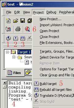 (5)C程序文件已被加到了項(xiàng)目中了,下面就剩下編譯運(yùn)行了。這個項(xiàng)目只是用做學(xué) 習(xí)新建程序項(xiàng)目和編譯運(yùn)行仿真的基本方法,所以使用軟件默認(rèn)的編譯設(shè)置,它不會生成用 于芯片燒寫的 HEX 文件。先來看圖 1-7 吧,圖中 1、2、3 都是編譯按鈕,不一樣是 1 是用 于編譯單個文件。2 是編譯鏈接當(dāng)前項(xiàng)目,如果先前編譯過一次之后文件沒有做動編輯改動, 這個時候再點(diǎn)擊是不會再次重新編譯的。3 是重新編譯,每點(diǎn)擊一次均會再次編譯鏈接一次,不 管程序是否有改動。在 3 右邊的是停止編譯按鈕,只有點(diǎn)擊了前三個中的任一個,停止按鈕 才會生效。5 是菜單中的它們。在 4 中能看到編譯的錯誤信息和使用的系統(tǒng)資源情況等, 以后我們要查錯就靠它了。6 是有一個小放大鏡的按鈕,這就是開啟\關(guān)閉調(diào)試模式的按鈕, 它也存在于菜單 Debug-Start\Stop Debug Session,快捷鍵為 Ctrl+F5。
