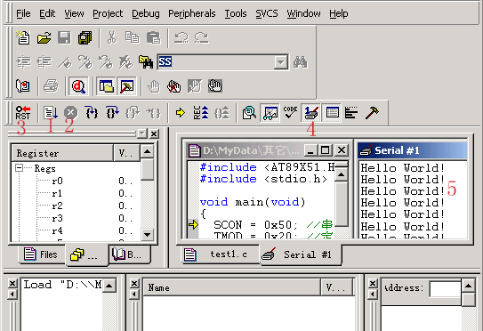 (6)進(jìn)入調(diào)試模式,軟件窗口樣式大致如圖 1-8 所示。圖中 1 為運(yùn)行,當(dāng)程序處于停止 狀態(tài)時才有效,2 為停止,程序處于運(yùn)行狀態(tài)時才有效。3 是復(fù)位,模擬芯片的復(fù)位,程序 回到最開頭處執(zhí)行。按 4 能打開 5 中的串行調(diào)試窗口,這個窗口能看到從 51 芯片的串 行口輸入輸出的字符,這里的第一個項(xiàng)目也正是在這里看運(yùn)行結(jié)果。這些在菜單中也有。首 先按 4 打開串行調(diào)試窗口,再按運(yùn)行鍵,這個時候就能看到串行調(diào)試窗口中不斷的打印“Hello World!”。最后要停止程序運(yùn)行回到文件編輯模式中,就要先按停止按鈕再按開啟\關(guān)閉調(diào)試 模式按鈕。然后就能進(jìn)行關(guān)閉 KEIL 等相關(guān)操作了。