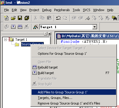 為 test1.c,保存在項(xiàng)目所在的目錄中,這個時候您會發(fā)現(xiàn)程序單詞有了不一樣的顏色,說明 KEIL的C語言語法檢查生效了。如圖 1-6 鼠標(biāo)在屏幕左邊的 Source Group1 文件夾圖標(biāo)上右擊彈出 菜單,在這里能做在項(xiàng)目中增加減少文件等操作。選“Add File to Group ‘Source Group 1’” 彈出文件窗口,選擇剛剛保存的文件,按 ADD 按鈕,關(guān)閉文件窗,程序文件已加到項(xiàng)目中了。這個時候在 Source Group1 文件夾圖標(biāo)左邊出現(xiàn)了一個小+號說明,文件組中有了文件,點(diǎn)擊它能展開查看。