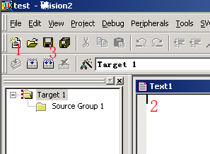 (3)首先在項(xiàng)目中創(chuàng)建新的程序文件或加入舊程序文件。如果您沒有現(xiàn)成的程序,那 么就要新建一個程序文件。在 KEIL 中有一些程序的 Demo,在這里我們還是以一個 C 程序 為例介紹如何新建一個 C 程序和如何加到您的第一個項(xiàng)目中吧。點(diǎn)擊圖 1-5 中 1 的新建文 件的快捷按鈕,在 2 中出現(xiàn)一個新的文字編輯窗口,這個操作也能通過菜單 File-New 或 快捷鍵 Ctrl+N 來實(shí)現(xiàn)。好了,現(xiàn)在能編寫程序了。下面是經(jīng)典的一段程序,呵,如果您看過別的程序書也許也有類似的程序: