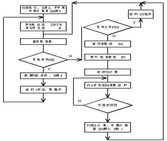 我們將每一音符的時間常數和其對應的節拍常數作為一組,按次序將樂曲中的所有常數排列成一個表,然后由查表程序依次取出,產生音符并控制節奏,就能實現演奏效果。此外,結束符和體止符能分別用代碼00H和FFH來表示,若查表結果為00H,則表示曲子終了;若查表結果為FFH,則產生對應的停頓效果。為了產生手彈的節奏感,在某些音符(例如兩個相同音符)音插入一個時間單位的頻率略有不一樣的音符。