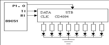 例:用8051單片機串行口外接CD4094擴展8位并行輸出口,如圖所示,8位并行口的各位都接一個發光二極管,要求發光管呈流水燈狀態。 串行口方式0的數據傳送可采用中斷方式,也可采用查詢方式,無論哪種方式,都要借助于TI或RI標志。串行發送時,能靠TI置位(發完一幀數據后)引起中斷申請,在中斷服務程序中發送下一幀數據,或者通過查詢TI的狀態,只要TI為0就繼續查詢,TI為1就結束查詢,發送下一幀數據。在串行接收時,則由RI引起中斷或對RI查詢來確定何時接收下一幀數據。無論采用什么方式,在開始通信之前,都要先對控制寄存器SCON進行初始化。在方式0中將,將00H送SCON就能了。